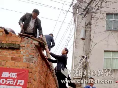 党员朱培华(左一)亲自揭自家猪圈的瓦。