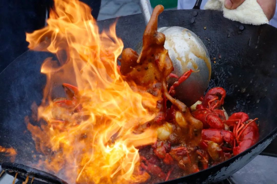 活动现场,大厨现场烹制油焖大虾,50斤龙虾,一个小时不到就全部卖完了