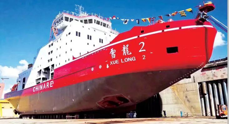 2018年9月,13000吨级,总长122.5米、宽22.3米、结构吃水8.3米,装载能力约4500吨,最大航速16.8节的“雪龙2”号顺利出坞,无论是在破冰技术、智能化体系还是人性化设计等方面,均处于国际领先水平。