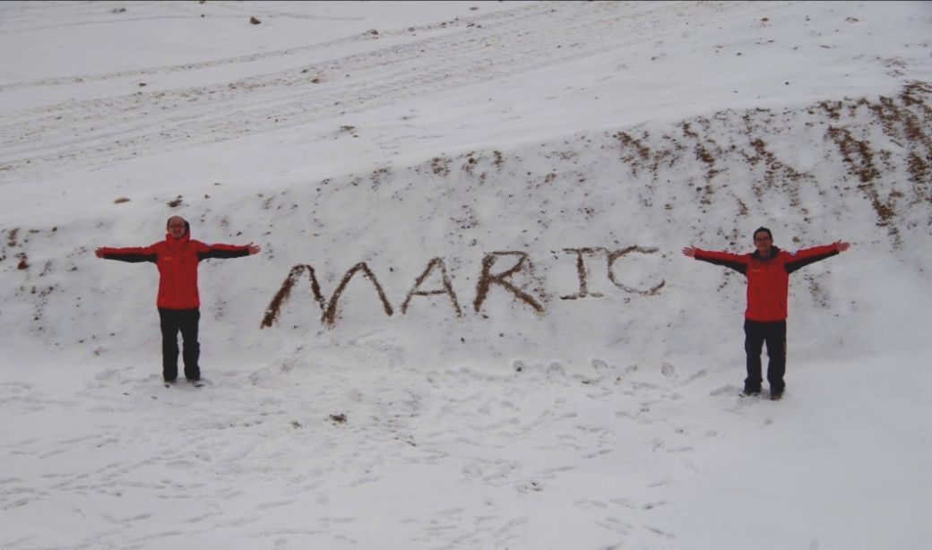 在中山站的冰雪中,吴刚和同事刻下了中国船舶及海洋工程设计研究院MARIC的logo,以纪念每一个中国人、每一个极地人、每一个造船人的伟大。