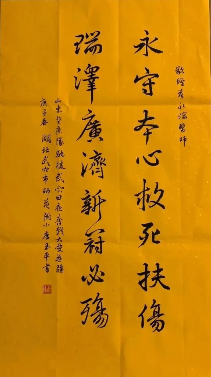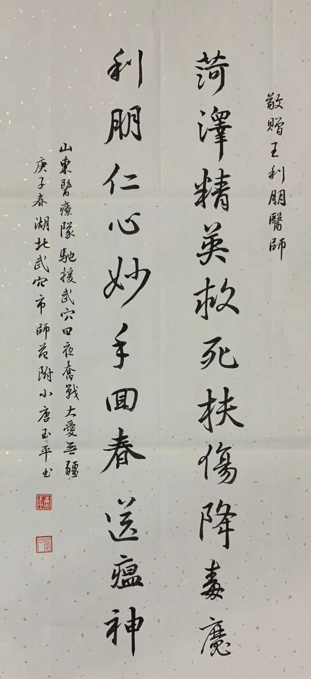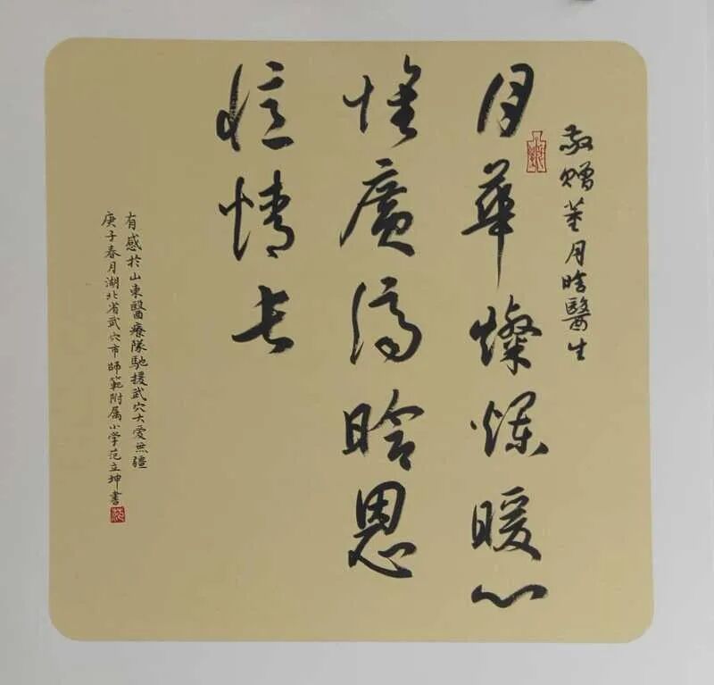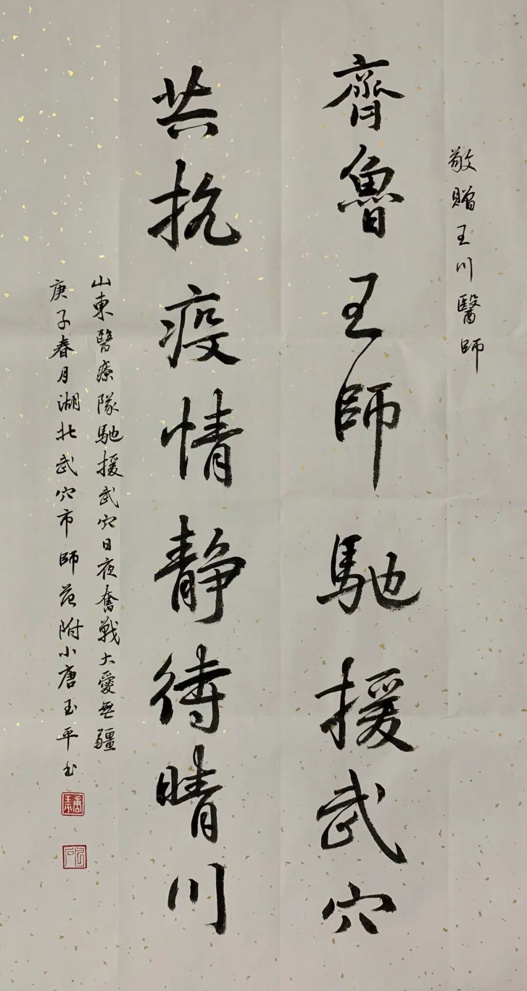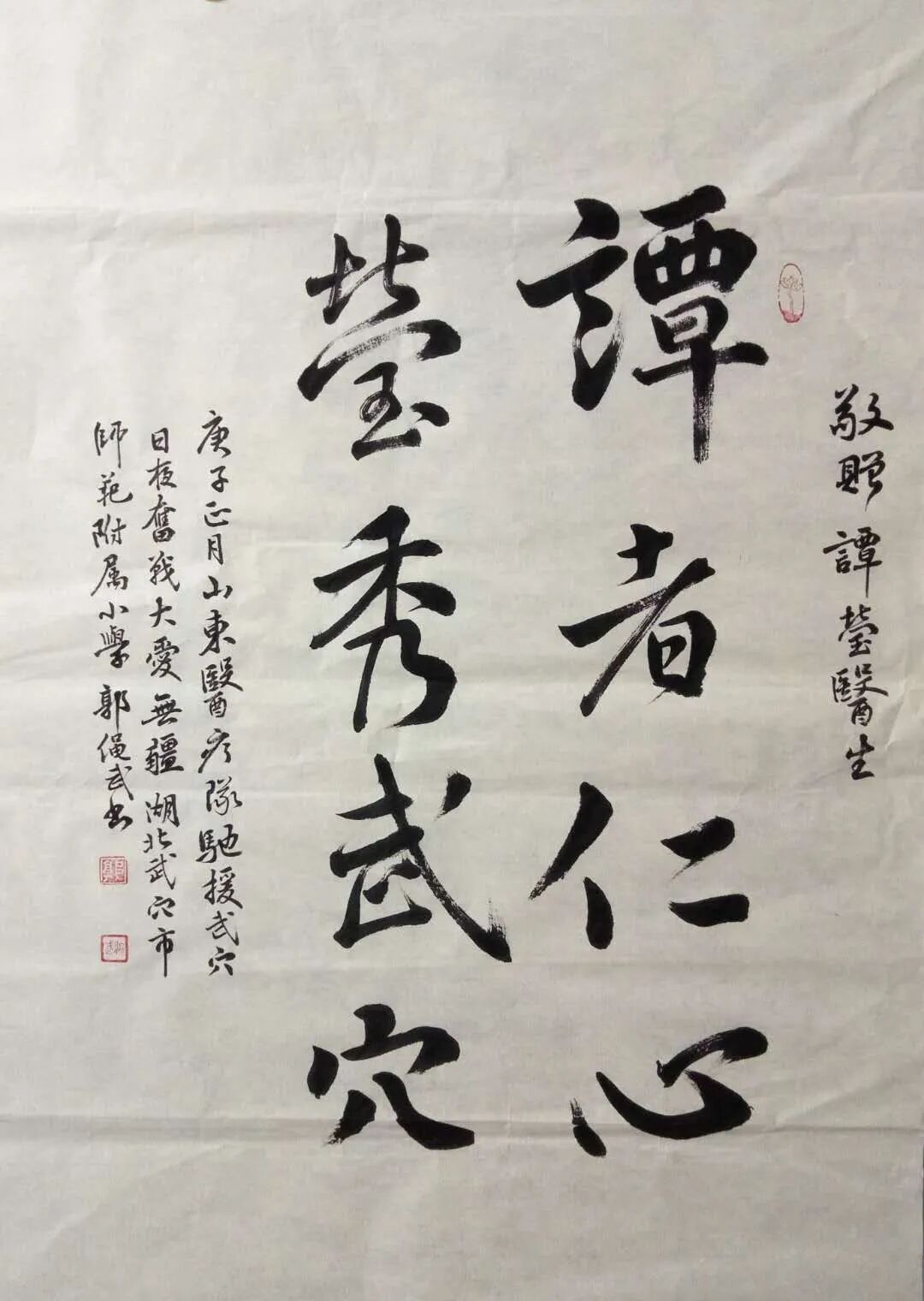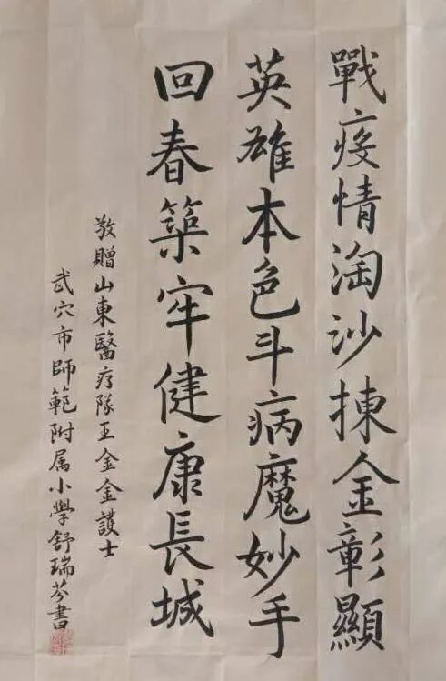 2月份,山东医疗队两批医护人员千里驰援武穴,与武穴人民共同抗击疫情,他们的大爱情怀深深打动了武师附小全体教师的心。该如何表达对他们的感激之情呢?在校长涂玉霞的提议下,决定向前来支援的山东医务工作者每人赠送一幅书法作品,并把50名逆行者名字镶嵌其中,个性订制,独一无二。