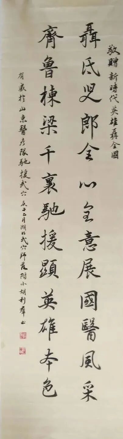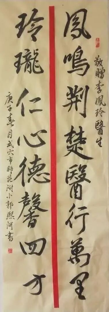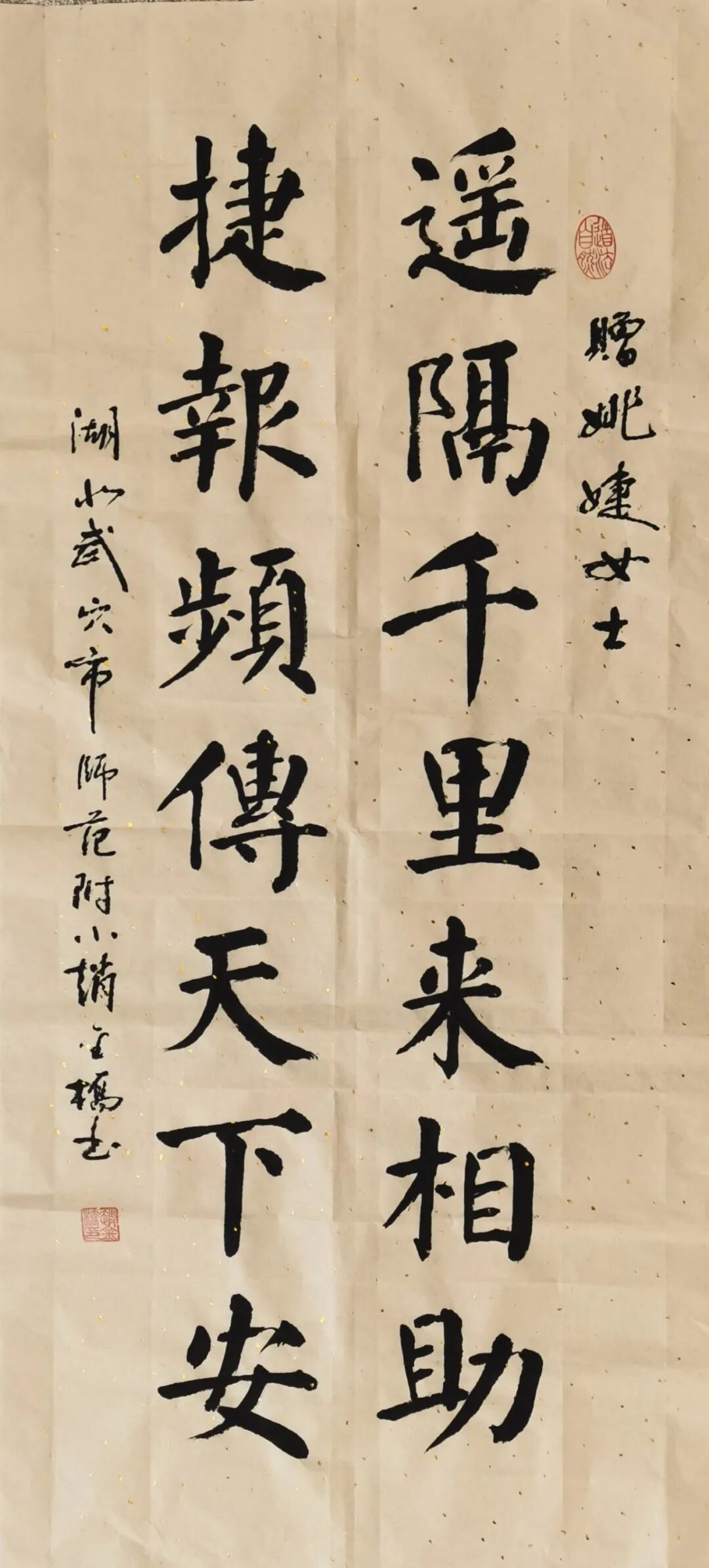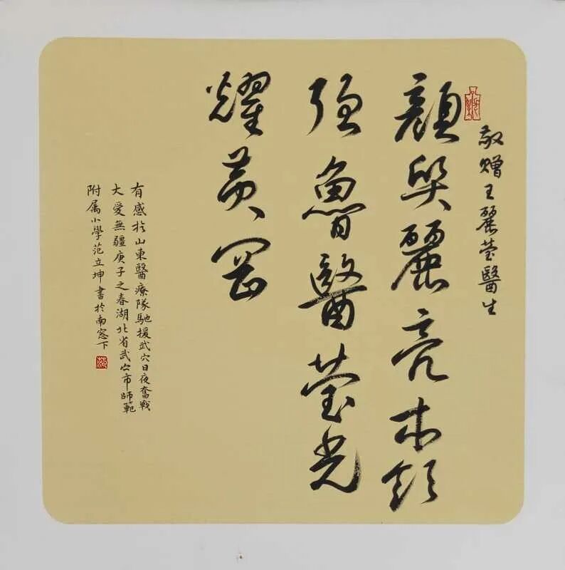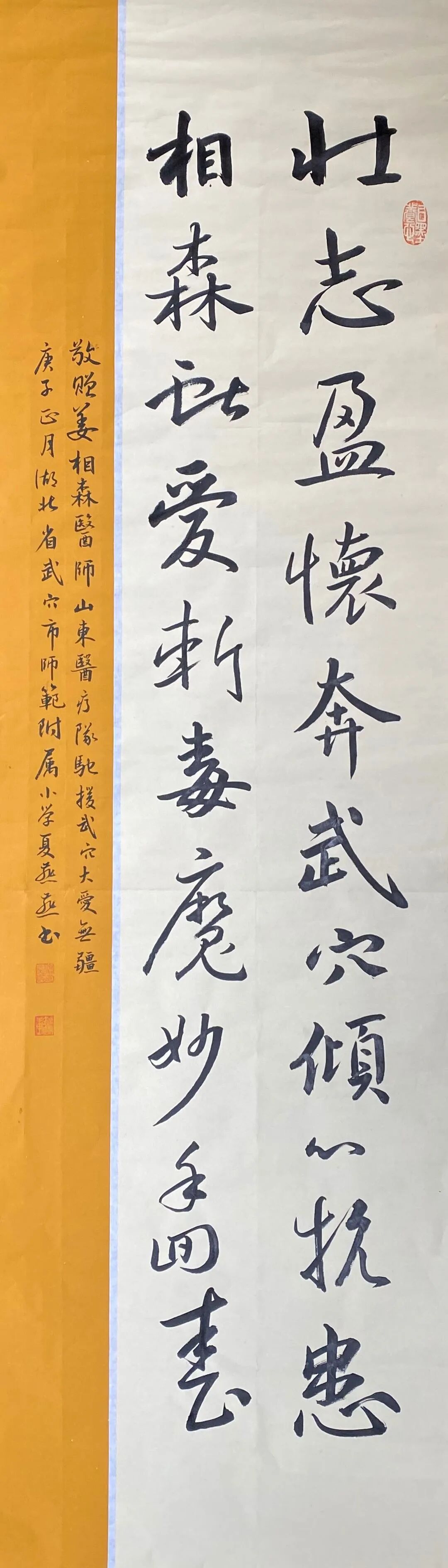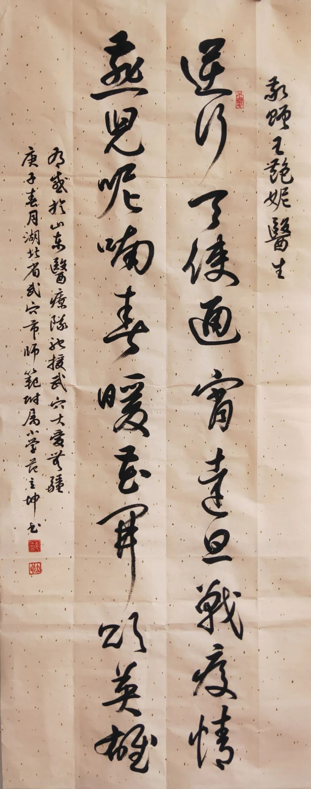 2月份,山东医疗队两批医护人员千里驰援武穴,与武穴人民共同抗击疫情,他们的大爱情怀深深打动了武师附小全体教师的心。该如何表达对他们的感激之情呢?在校长涂玉霞的提议下,决定向前来支援的山东医务工作者每人赠送一幅书法作品,并把50名逆行者名字镶嵌其中,个性订制,独一无二。