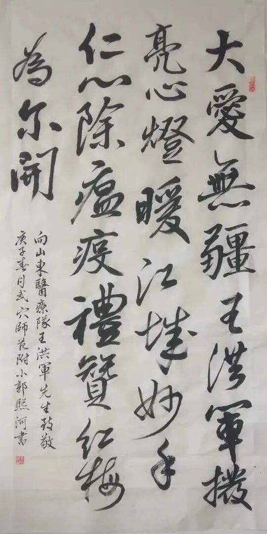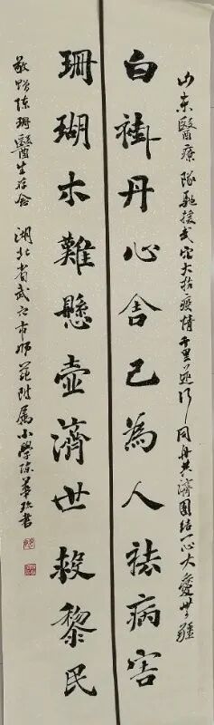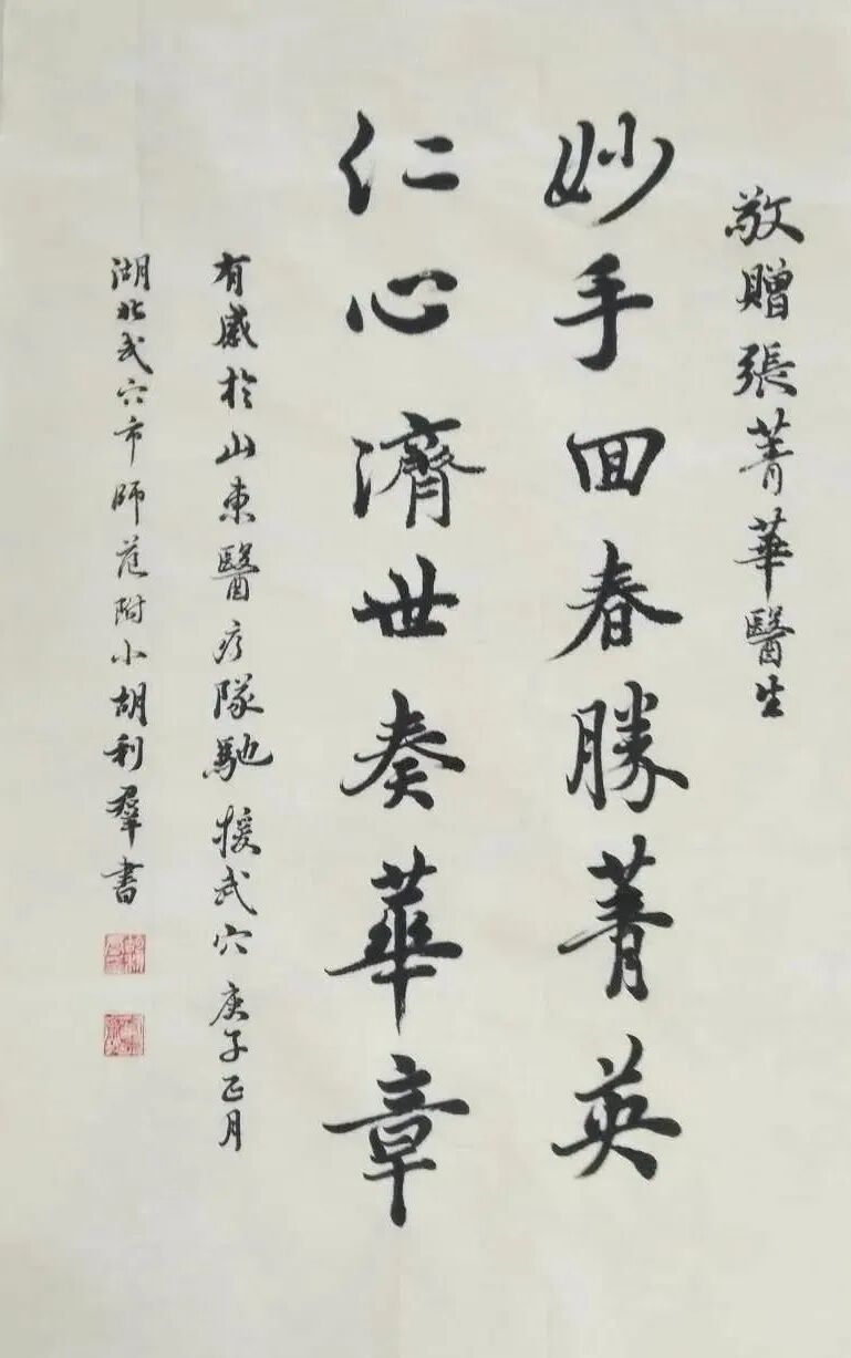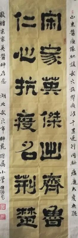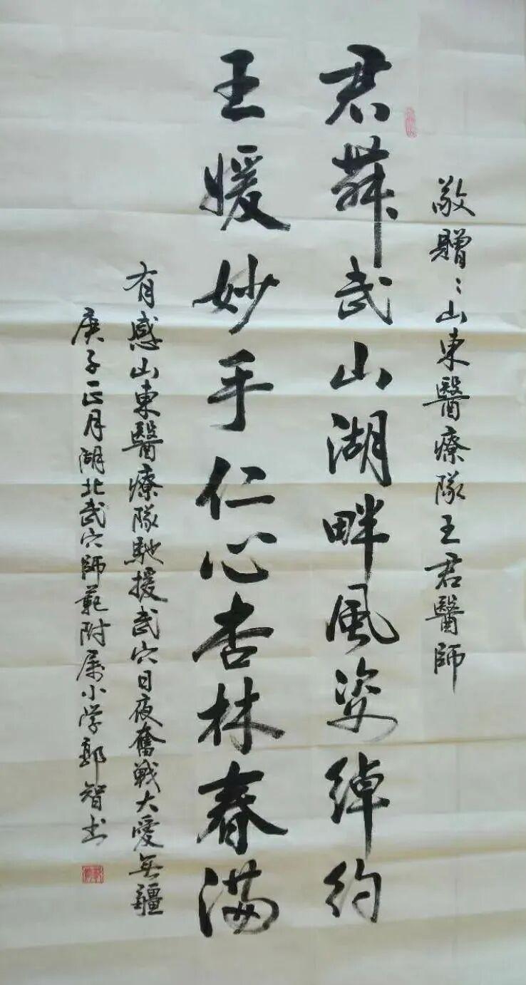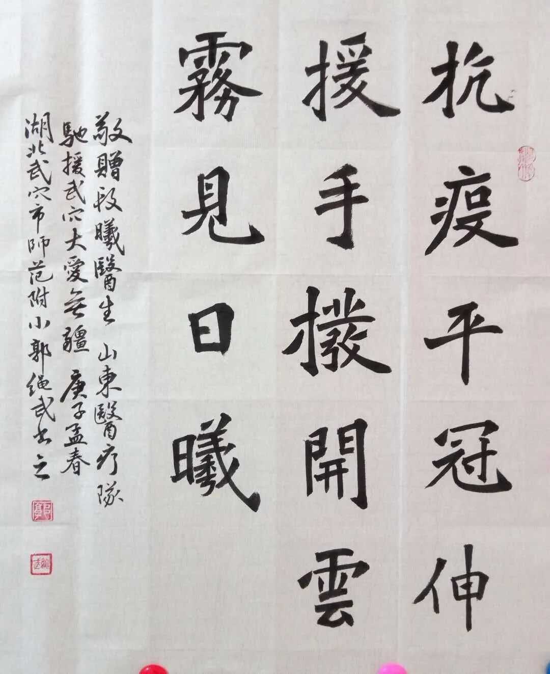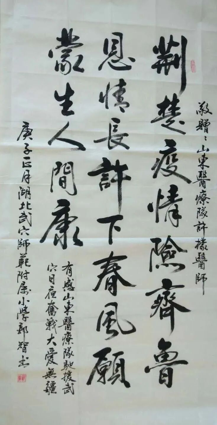 “逆行识君子,超德艳古今。”“李氏精英,术业专攻根植医学显身手;博爱无疆,齐鲁儿女情系武穴抗疫情。”“医心光明,只为健康。”2月21日,由武师附小兰亭书法社教师们书写的50份书法作品新鲜出炉。每一幅作品都包含着对山东医务工作者们的感激之情。