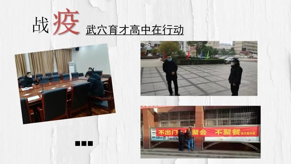 疫情面前,育才教师在校长罗平安的领导下,共克时艰,尽一份力量,担一份责任,在不到十天时间内,266名教师先后两次捐款共119967元;程淑芬老师还另捐500只口罩。美术教师陈国权用画笔绘下钟南山和武穴市医务人员抗击新冠肺炎动人瞬间,让众人铭记时代楷模和医者仁心的光辉形象。音乐教师舒琳歌曲《坚强黄冈 黄冈坚强》致英雄,助力家乡夺取抗击疫情胜利。戴益健老师《居家体育运动锻炼》教学视频帮助大家保持健康的生活状态,提高自身免疫力,强身战“疫”。办公室主任陈少峰舍小家顾大家,毅然担负疫情最严重育才教师宿舍防控,不分昼夜摸排三个单元48户156名教职员工及家属身体和生活状况,按时消毒配送米、油、菜、药品等生活用品,成为学校宿舍楼的暖心管家。还有学校广大党员教师深入到社区成为社区和楼栋志愿者、包保责任人、值守者,罗平安、姜利安、王汉中、李博等领导坚持学校值守包保学校宿舍;陶磊、干春晓、刘堂卿、刘志辉、杨宇峰、苏卫红、解学文、张鼎、饶建文、戚治刚、郑艳云、易雄斌、余本干、程晓军、文华、陈定军、郭熙银、周国斌、查华云、郭丹、吴步云等一大批党员和教师在社区楼栋值守,参与防疫志愿活动,用爱心传递正能量。高三年级在陈才兴副校长、苏卫红主任组织下,联系九科备课组长和14位班主任,每日摸排高三63位教师,832名学生的健康数据,制定网络教学实施方案,“停课不停学”,微机教师陈庚迅速整合上课平台。2月1日开始实行九科网上教学,吸引了黄石、鄂州等一大批地方的师生前往观课,盛赞学校高三网课优质、高效。通过高三网课,不仅凸显了学校教学质量的优质,更把师生情感联系在一起,其实老师一直在看不见的地方陪伴着你。