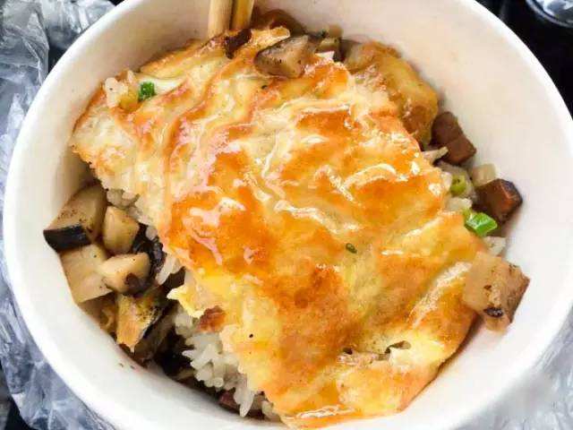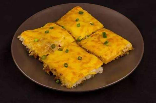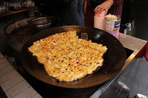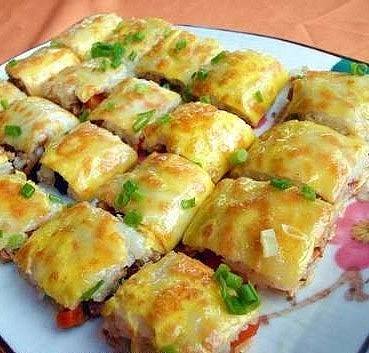 这时小伙子用手轻轻的先将皮子与锅分开一点、在锅边拖动一下,然后双手轻轻一带,那皮子仿似一张黄色的手帕一样,不曾裂开、更不曾断成几截,那样听话的在小伙子的手中翻了个面,那金黄色的一面朝底。然后如同被面上铺一层棉絮似的,铺上之前已经蒸熟的糯米,撒上鲜肉丁、鲜菇丁、鲜笋丁和卤干丁。