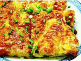 小伙子时而用刮铲压实糯米、时而将馅丁刮匀,时而将锅如帽子一样旋转。这样大约两三分钟,小伙子又如同颠簸箕一样的,将一锅做好的豆皮翻了个面,金黄的一面又朝上了。然后左手拿刮铲如尺、右手拿锅铲如刀一样整齐的将豆皮划成了小块,再撒上一些葱花。一锅豆皮就成了。
