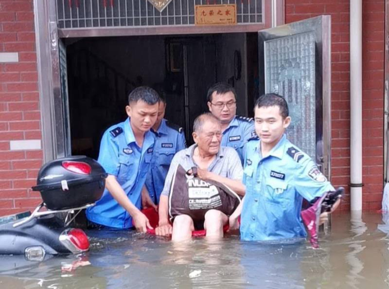 因暴雨影响,天宝街广大家园一片汪洋,两位70多岁的老人被困二楼。龙潭派出所接警后,将两位老人背到一楼,用竹篙绑好放上脚盆,将老人及生活用品送到安全地带,随后联系社区干部妥善安置两位老人。