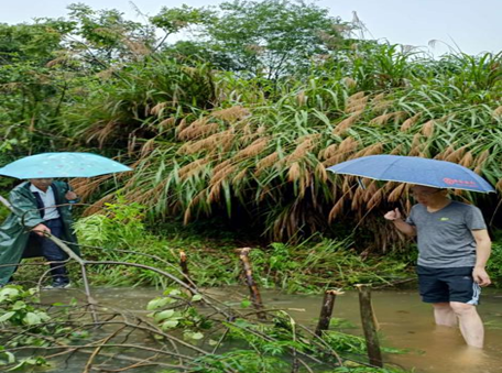 转到三组的大塘,发现泄水口被树枝挡住了,随时有漫塘溃坝危险,眼看着水流急涨,时间不等人,他和张在强来不及多想,跳下塘,伸手摸到塘底捞出树枝杂草,雨势越来越大,他们索性扔下伞,淋着雨浸泡在雨水中……经过半个多小时的抢险,终于为垸塘洪涝清理出一条通畅的排水路,从而在第一时间保护了塘下15户住户和百余亩稻田的安全。等他们上岸,衣鞋已全湿透,泥土蹭满了身,俨然成了个泥水人,他们俩人相视点头,看着隐患排除,终于放了心。雨依然未停,他们一路巡险除险过来,又是泥浆又是水,衣服湿了又干,干了又湿,泥巴蹭上身,更像是农村人了。