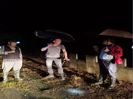汛情就是命令。凌晨四点,暴雨强势来袭,陈广水库、龚洼水库水位告急,去往陈广水库的桥洞、道路已被渠道水漫灌至膝盖, 临近公路的稻田被淹……险象环生,半夜巡坝回来,来不及休息调整,五点天微亮,早上开个碰头会,按照各自分工,他们又出发了。
