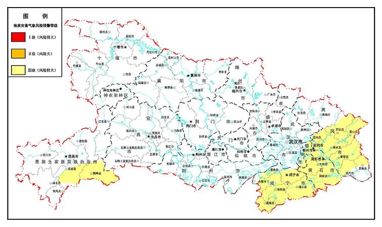 2020年7月9日20时-7月10日20时,预计鄂州市、黄石地区、咸宁地区,恩施(宣恩、鹤峰)、黄冈(黄州区、团风、罗田、英山、浠水、蕲春、武穴、黄梅北部)以及其他暴雨中心发生崩塌、滑坡、泥石流的风险较大(Ⅲ级),请相关地方政府及有关部门做好地质灾害防范工作。