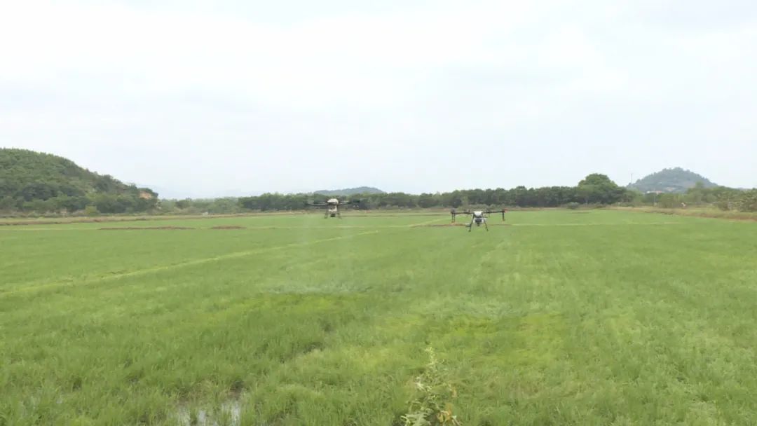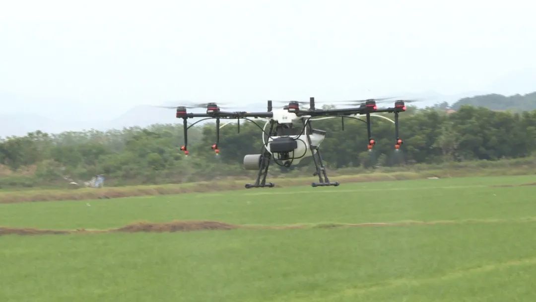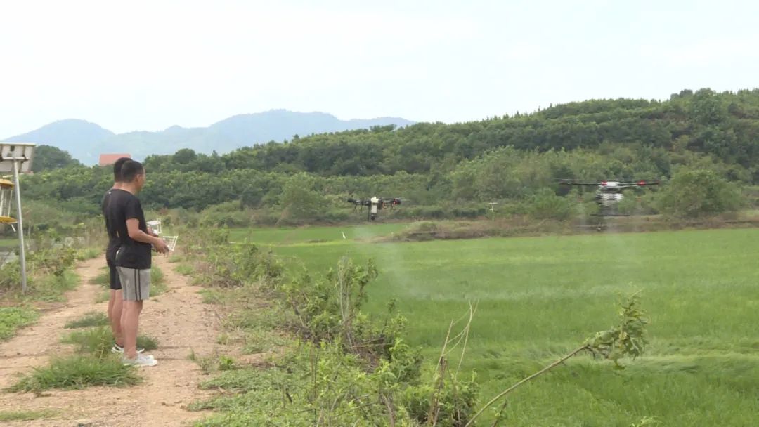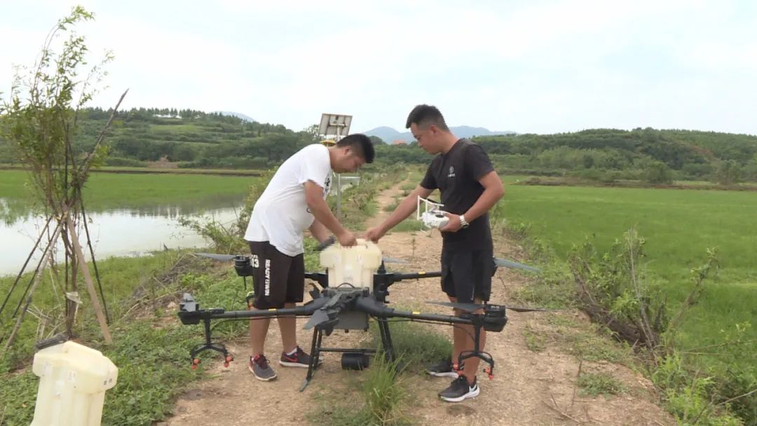 在农技专家的指导下,技术人员将搅拌均匀的药水倒入桶中,伴随着一阵螺旋桨的嗡嗡声,植保无人机起飞升空,在技术人员的娴熟操作下,无人机便沿着绿油油的稻田一路向前飞去,快速均匀高效地喷撒下药雾。