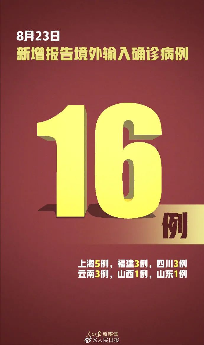 据国家卫生健康委员会官方网站消息,8月23日0—24时,31个省(自治区、直辖市)和新疆生产建设兵团报告新增确诊病例16例,均为境外输入病例(上海5例,福建3例,四川3例,云南3例,山西1例,山东1例);无新增死亡病例;新增疑似病例1例,为境外输入病例(在上海)。