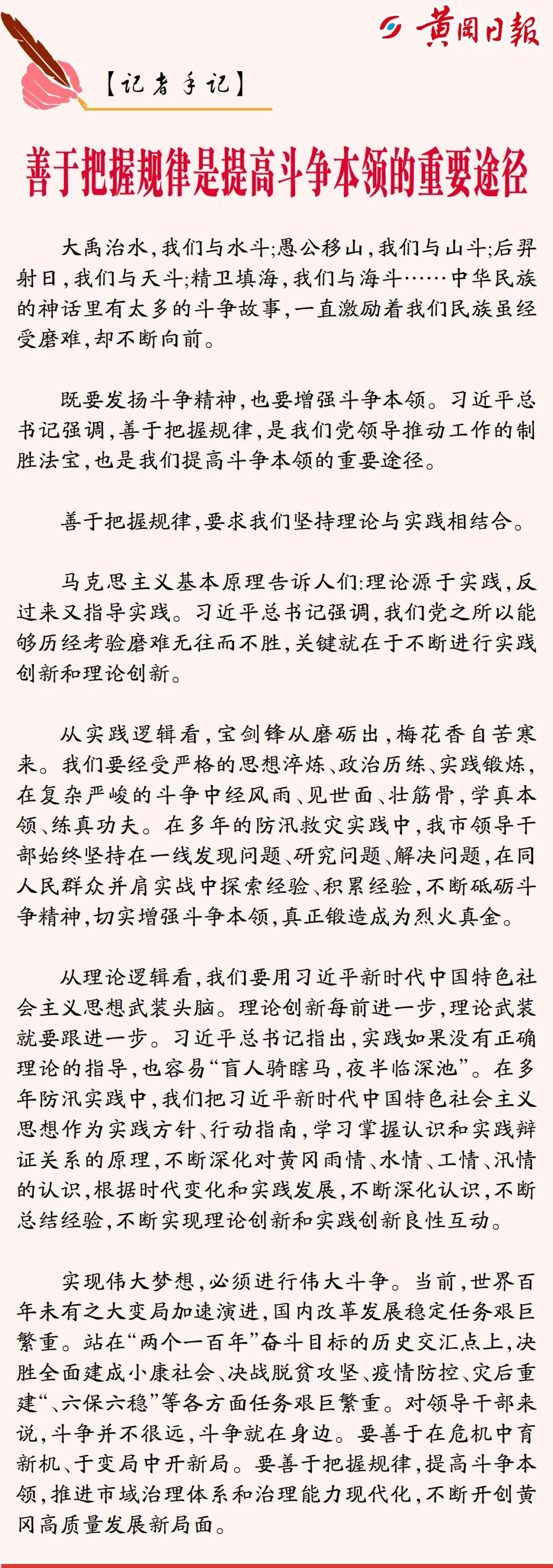 在伟大斗争实践中增强斗争本领、掌握斗争方法。实践证明,一系列防汛救灾规章制度的出台,成为黄冈今夏战汛的“加持利器”,为我们依法防汛、科学防汛,夺取抗击特大洪涝灾害斗争胜利赋予磅礴动能。