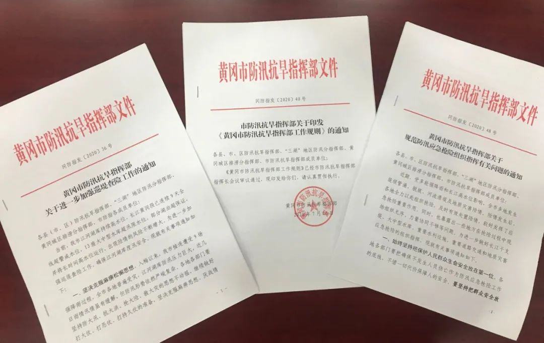 在今年防汛救灾关键时刻,市防汛抗旱指挥部制定印发了《关于迅速组织危险区域群众转移的命令》《黄冈市防汛抗旱指挥部工作规则》《黄冈市长江干支堤巡堤查险工作规范》 《关于规范防汛应急抢险组织指挥有关问题的通知》等文件。“四箭”连发,招招用力,推动全市防汛救灾制度化、规范化、标准化、科学化水平显著提升。