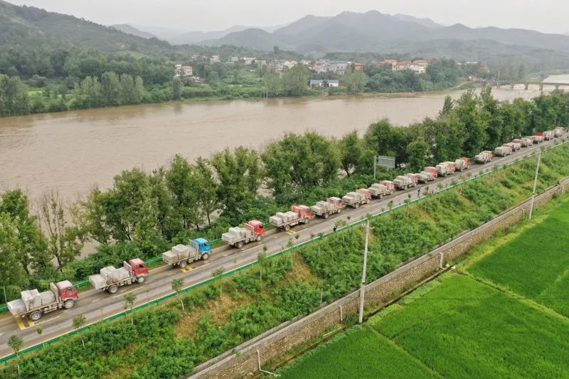 汛期行走黄冈长江沿线,备料库里石块、碎石堆积如山,装满石料的抢险救援车队排成长龙,正在集训的抢险队员,随时待命……