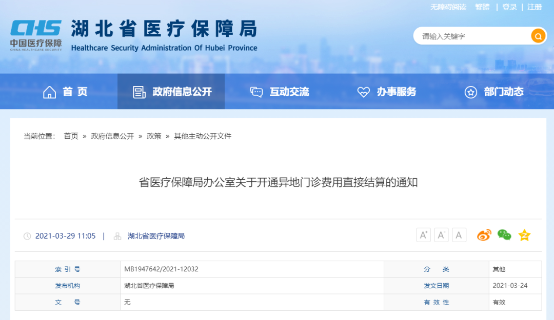 好消息!湖北省内异地门诊费用可直接结算! 2021-04-01 15:26 0 好消息! 从3月31日起 湖北省内异地门诊费用可直接结算! 3月31日起,湖北省内16个市(州)62家定点医疗机构开通职工医保异地普通门诊费用直接结算功能。 首批开通省内异地门诊费用直接结算的62家医疗机构名单看这里 医保卡省内异地就医 打通了空间壁垒和地域界限 使越来越多异地患者 享受到直接结算带来的便利 来源:湖北省医疗保障局、宜昌市医保服务中心