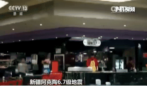 △在喀什市区一家餐厅,地震发生时有顾客正在向室外撤离,悬挂在高处的指引牌晃动则持续了十多秒。