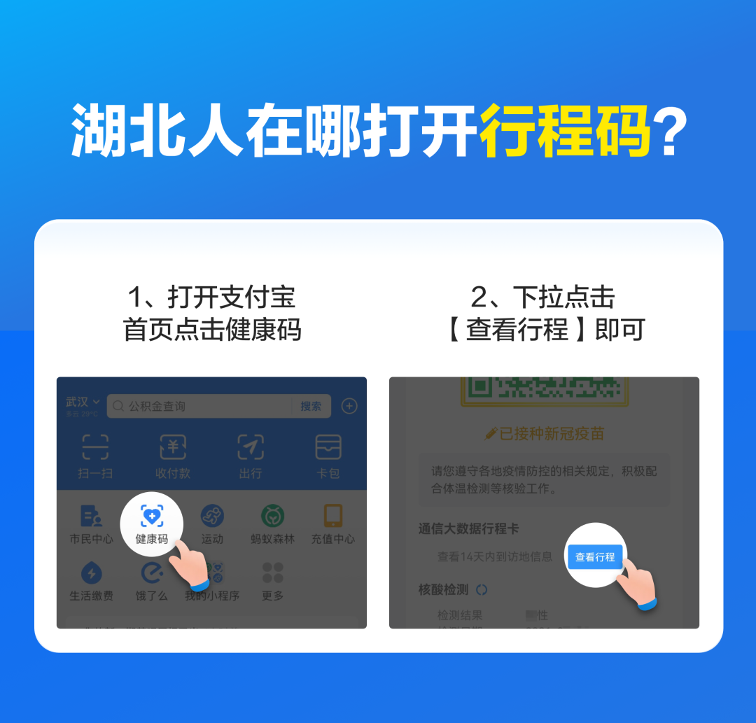 除此以外,群众还可以上支付宝通过填写手机号和验证码,便可查询本人14天内曾到访地信息。目前行程卡仅对到访地做出提醒,不关联健康状况。湖北市民如需查看本人的核酸检测结果,登录首页打开“健康码”页面,点击“核酸检测查询”,即可显示市民的核酸检测结果、采样地点及采样时间。