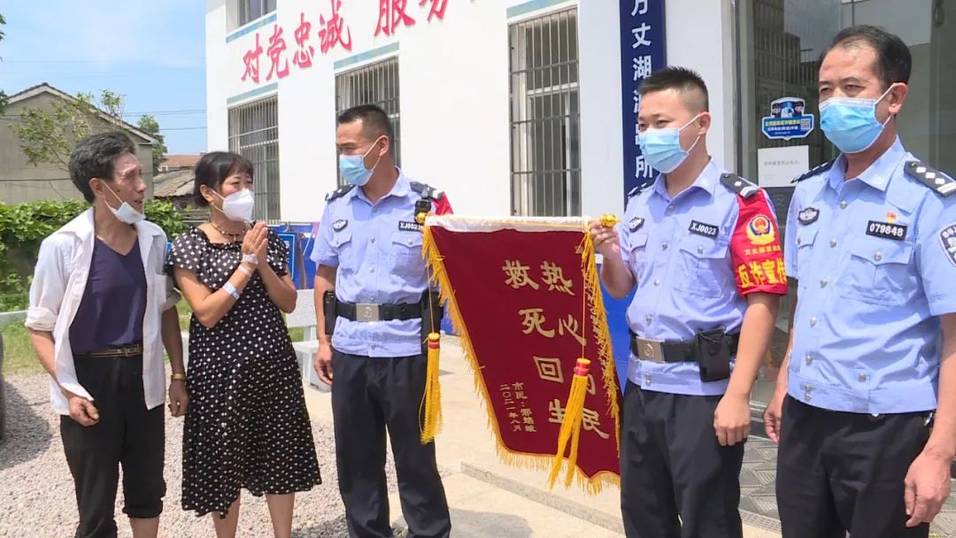 谢谢,真谢谢你们要不是你们,我们跟我孙子孙女都完了近日 70多岁的邢老汉带着女儿邢焰娥来到万丈湖派出所为该所的几位民警送上“热心为民 救死回生”的锦旗现场 邢焰娥几度哽咽表达对民警的感激之情