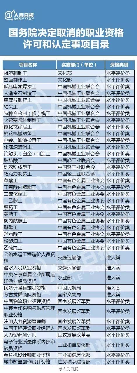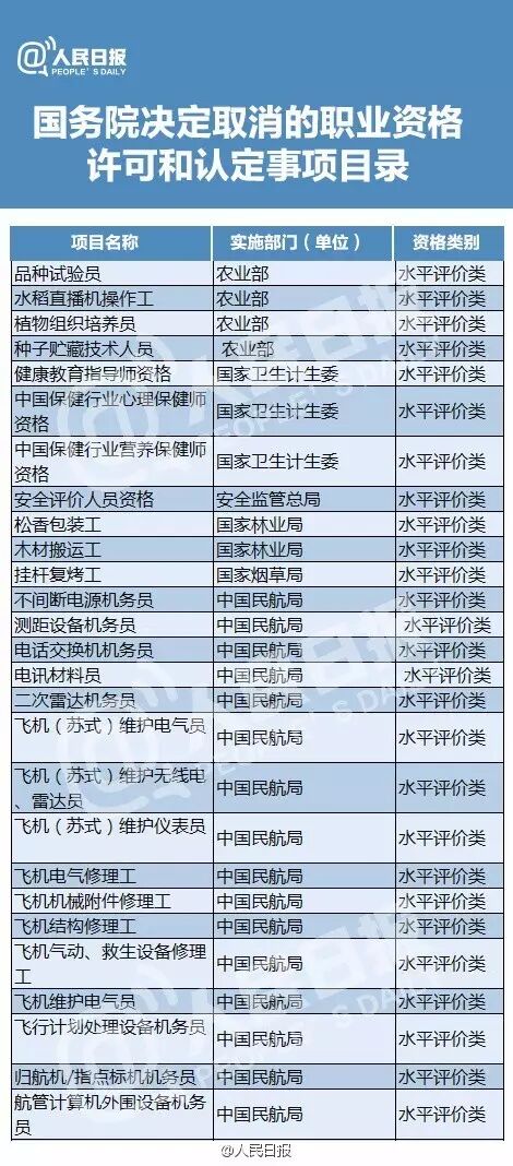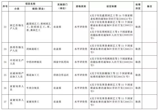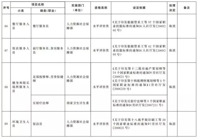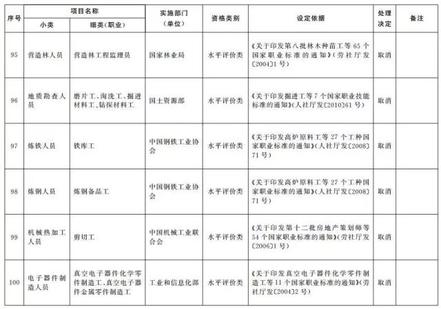 本次取消的职业资格许可和认定事项中,专业技术人员职业资格7项,其中准入类3项,水平评价类4项,涉及公路水运工程监理、防雷、管理咨询等领域;技能人员职业资格107项,均为水平评价类,涉及机械设备、食品加工和农业、文化、轻工等多个领域。