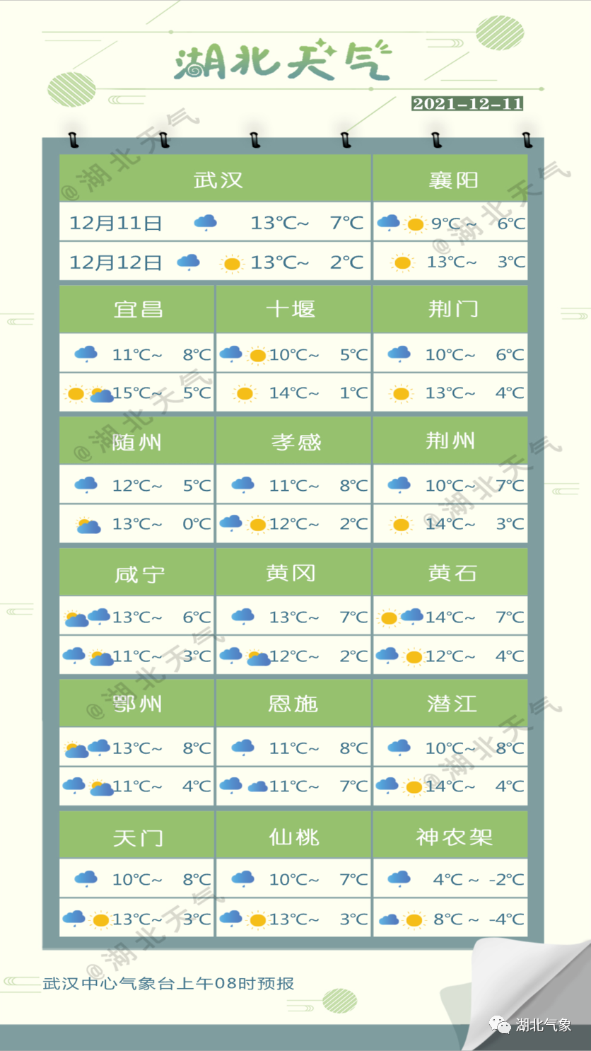 鄂西北北部、江汉平原北部阴天转多云;其他地区小雨转多云。西部高海拔地区有雨夹雪或雪。
