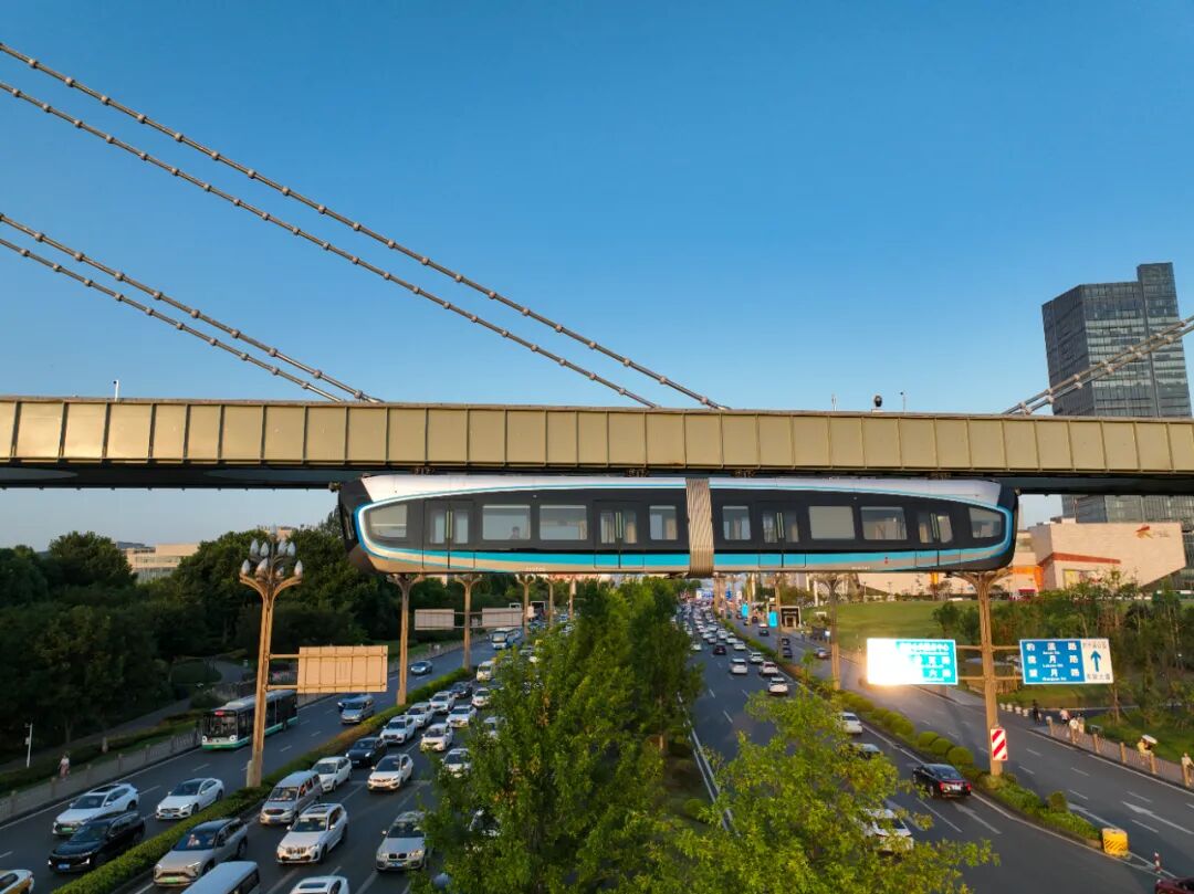 空轨列车采用全自动无人驾驶模式运营,最高运行时速60公里,初期采用2节编组,最多能容纳220余人,同时可在2-3节车厢之间灵活编组,适应不同客流运输需求。