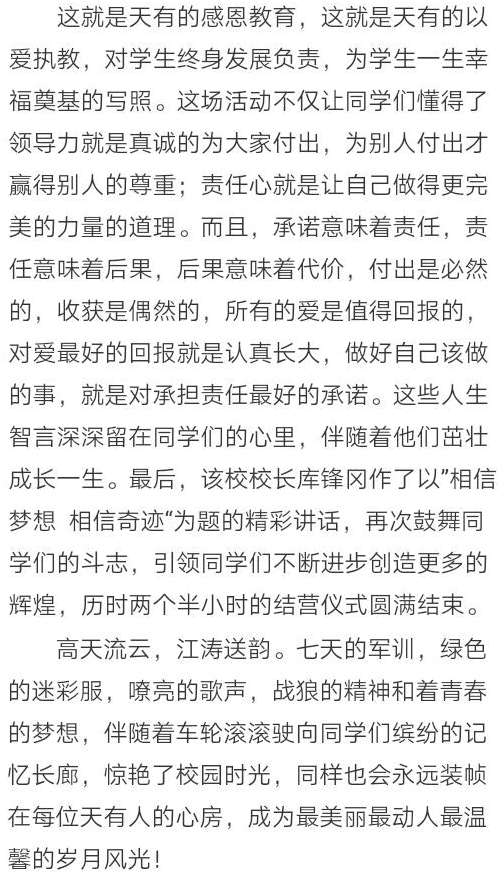 此次结营仪式与众不同,融家长会、感恩教育、励志教育与军训汇报表演于一体,创意新颖,精彩纷呈,内涵丰赡,寓意深远,学生和家长共同在身体和心灵上接受了一次洗礼,成为学校历届军训中最震撼、最振奋、最感动、最难忘的一次军训,反响强烈,好评如潮,充分体现了天有人的睿智创新和教育担当。