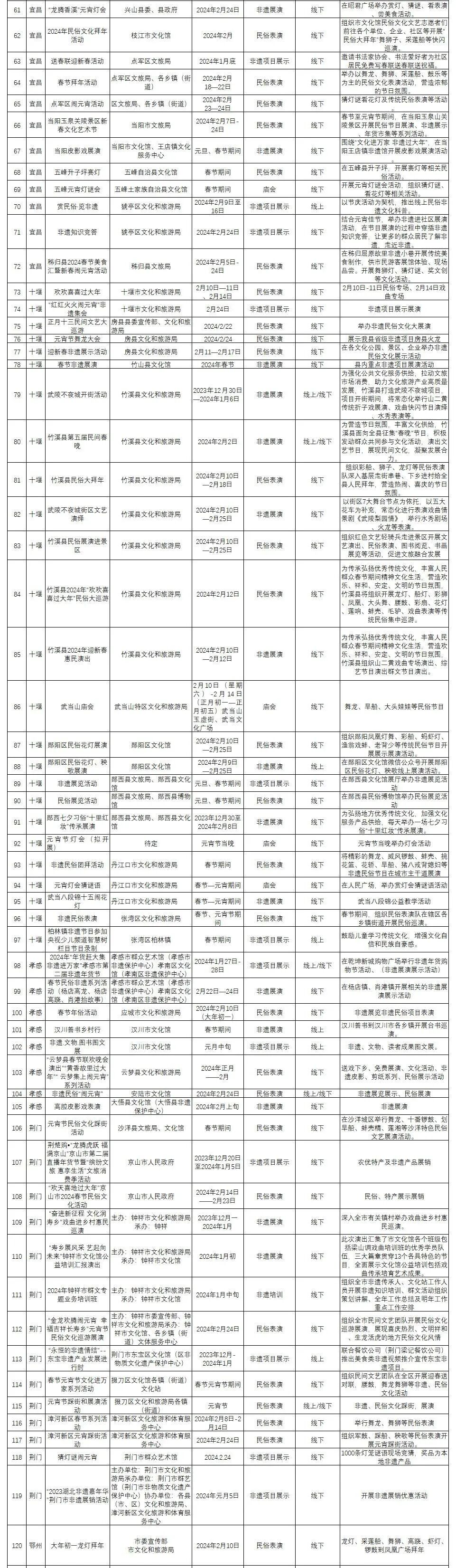 经汇总各市州情况,2023年元旦、春节期间各地举办非遗宣传展示和传承实践活动共计252场,含线下227场,线上25场。元旦期间已举办72场,还有180场活动正在或即将举办(见下表)。其中庙会、民俗表演活动83场,非遗项目展示展销活动80场,非遗展演活动69场,非遗课堂、非遗培训活动20场。