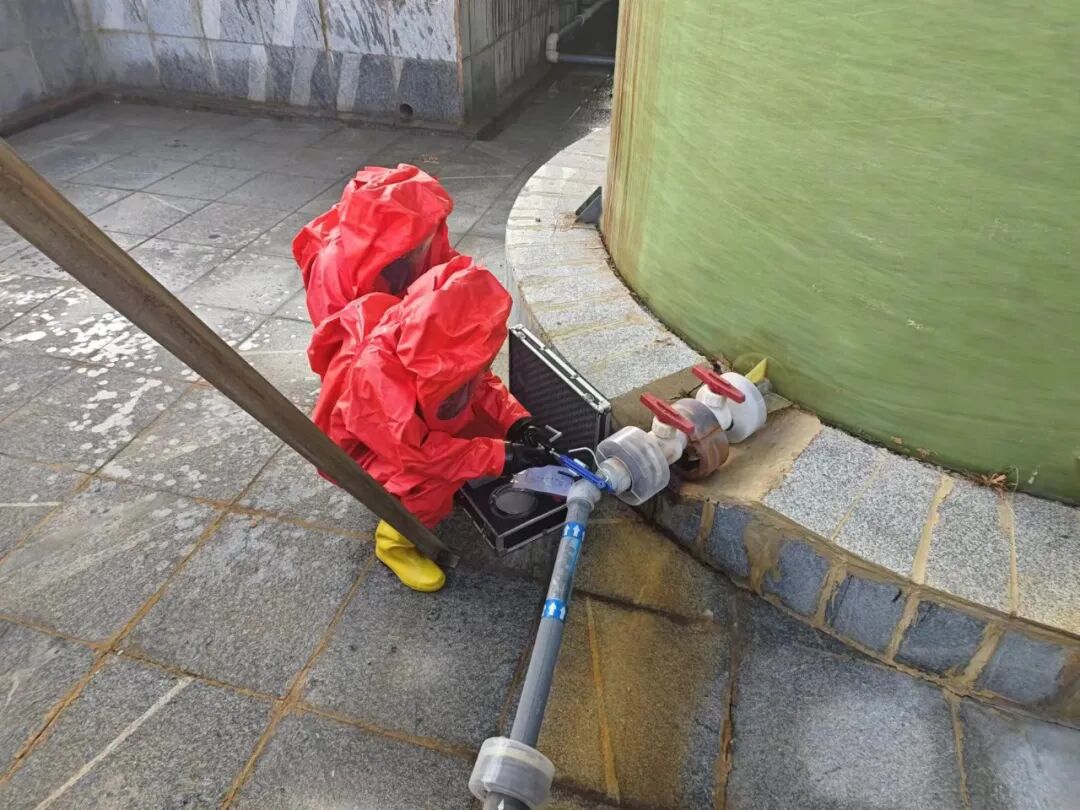 作战小组首先将水幕水枪阵地铺设开,阻断稀释、降解泄漏物浓度,随后,堵漏组队员也利用粘贴式堵漏工具及时堵住泄漏点。与此同时,大金政府专职队、广济药业专职队同步开展供水保障及现场警戒,对泄露的危化品残液及时收集。队伍全员洗消完毕后,所有人员集合进行人员及器材清点。