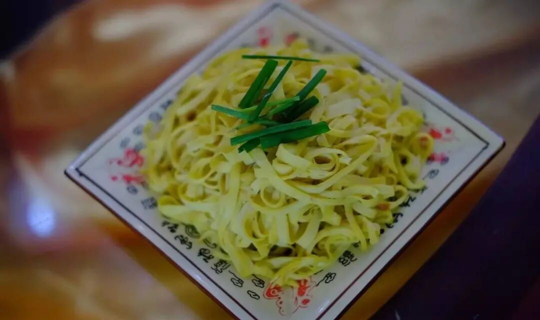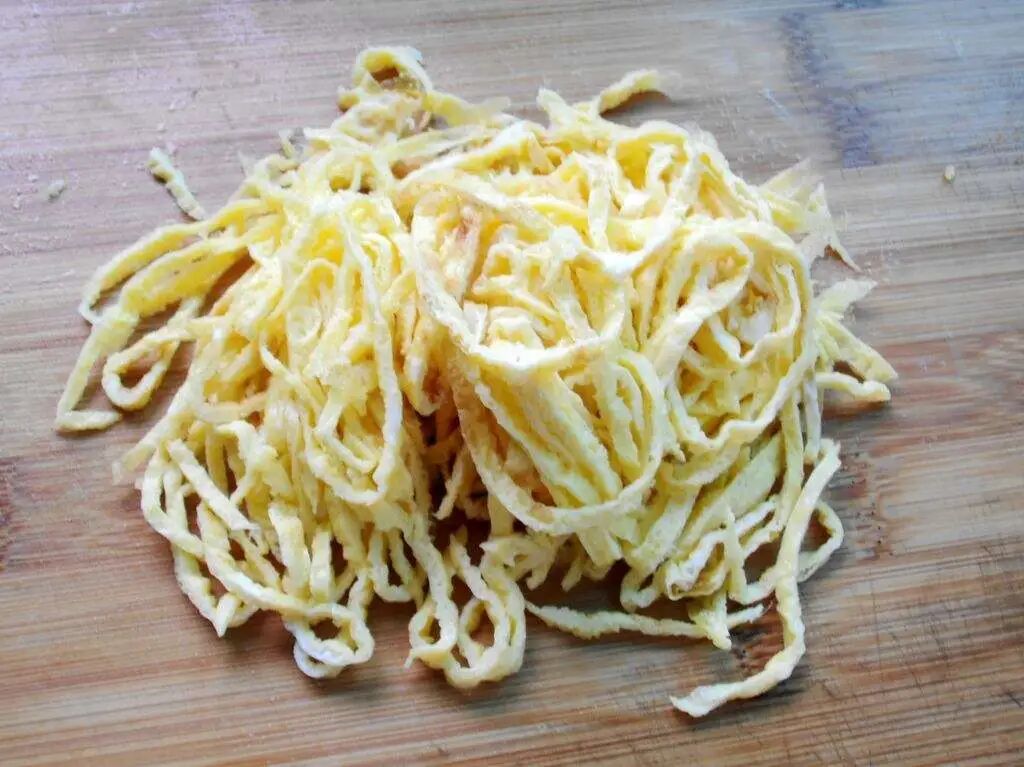 英山蛋丝色泽黄艳,蛋香浓郁,涮食久煮不烂,口感松软不失劲道。其实做法很简单,取正宗散养土鸡蛋打碎搅拌,同红薯粉加水搅拌成糊状,选平底锅将蛋糊摊成大张折圆形面皮,出锅晾凉切成丝状,装盘即可。