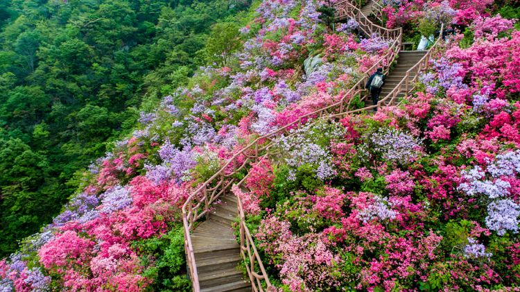 天马寨位于英山县雷家店镇境内,原名天马山,因为形似一匹奔腾的骏马而得名,每年3、4月份,景区内杜鹃花、野樱花、桐子花、桃花等次第开放,成为一道亮丽风景。现有10万亩古杜鹃、野樱花、油桐花群落,雄奇壮观。