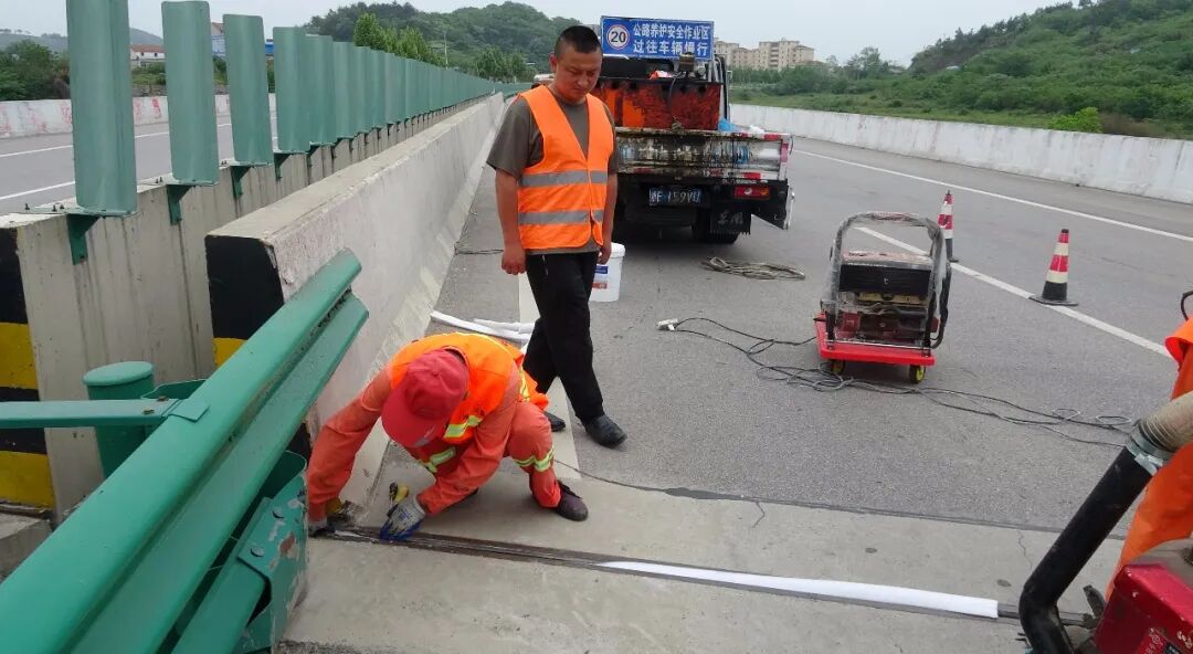 为做好桥梁伸缩缝维护,保证桥梁安全质量,该中心立即组织技术人员现场蹲点指导,抓住伸缩缝宽度此时为一年中最大的机会,利用新型专用道路密封胶对桥面伸缩缝进行更换。