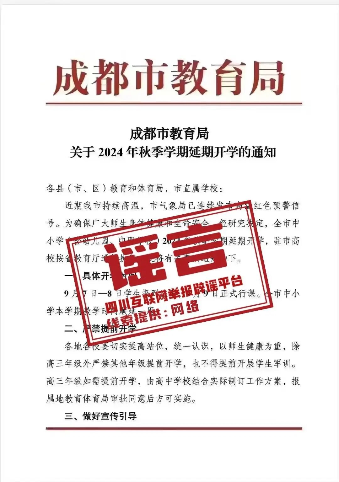 8月29日,一张关于2024年秋季学期延期开学的“红头文件”截图在成都多个家长群流传。