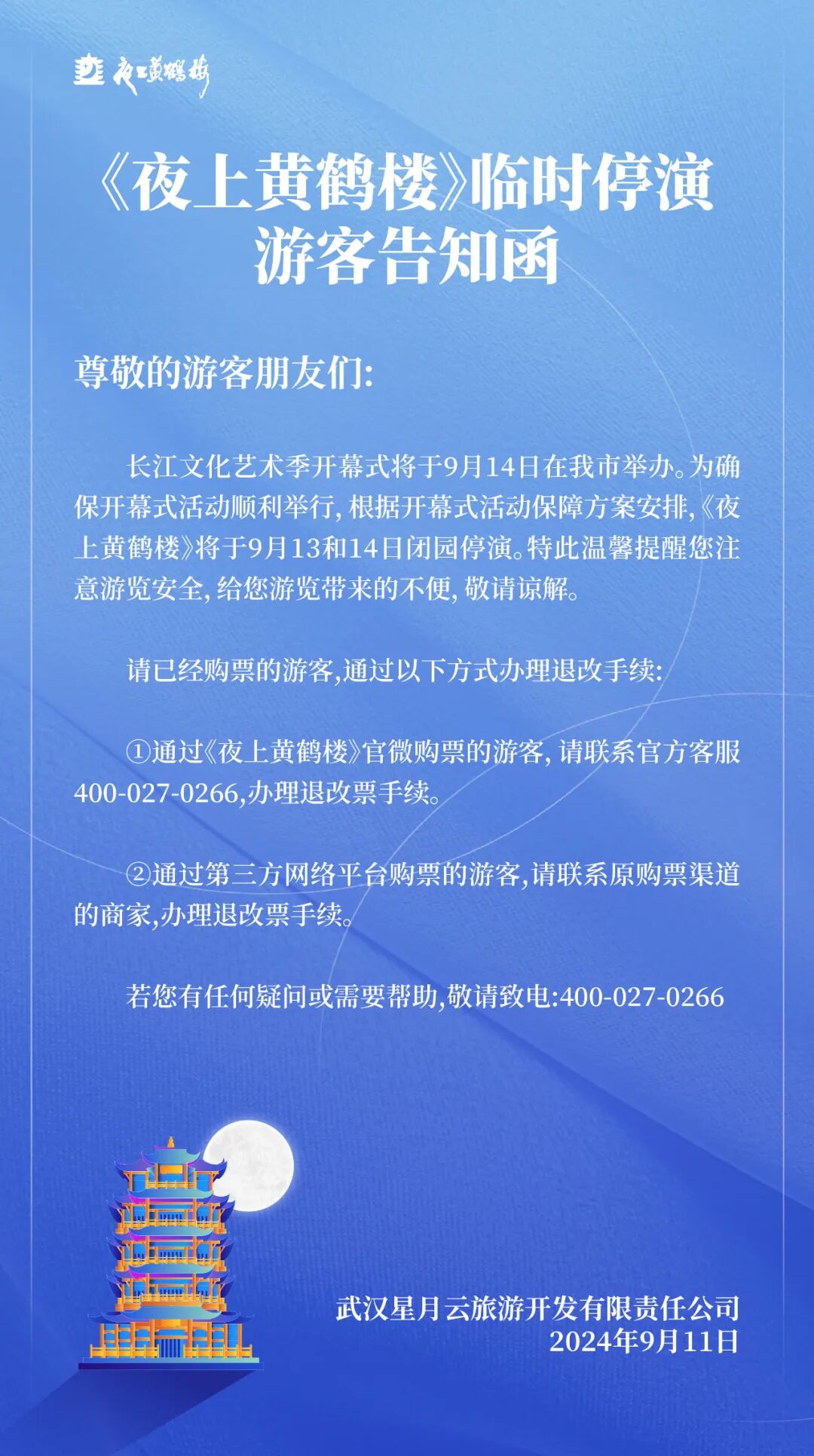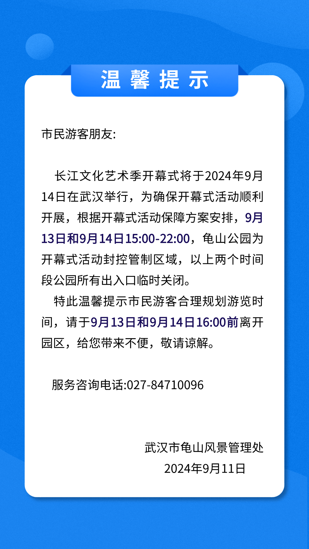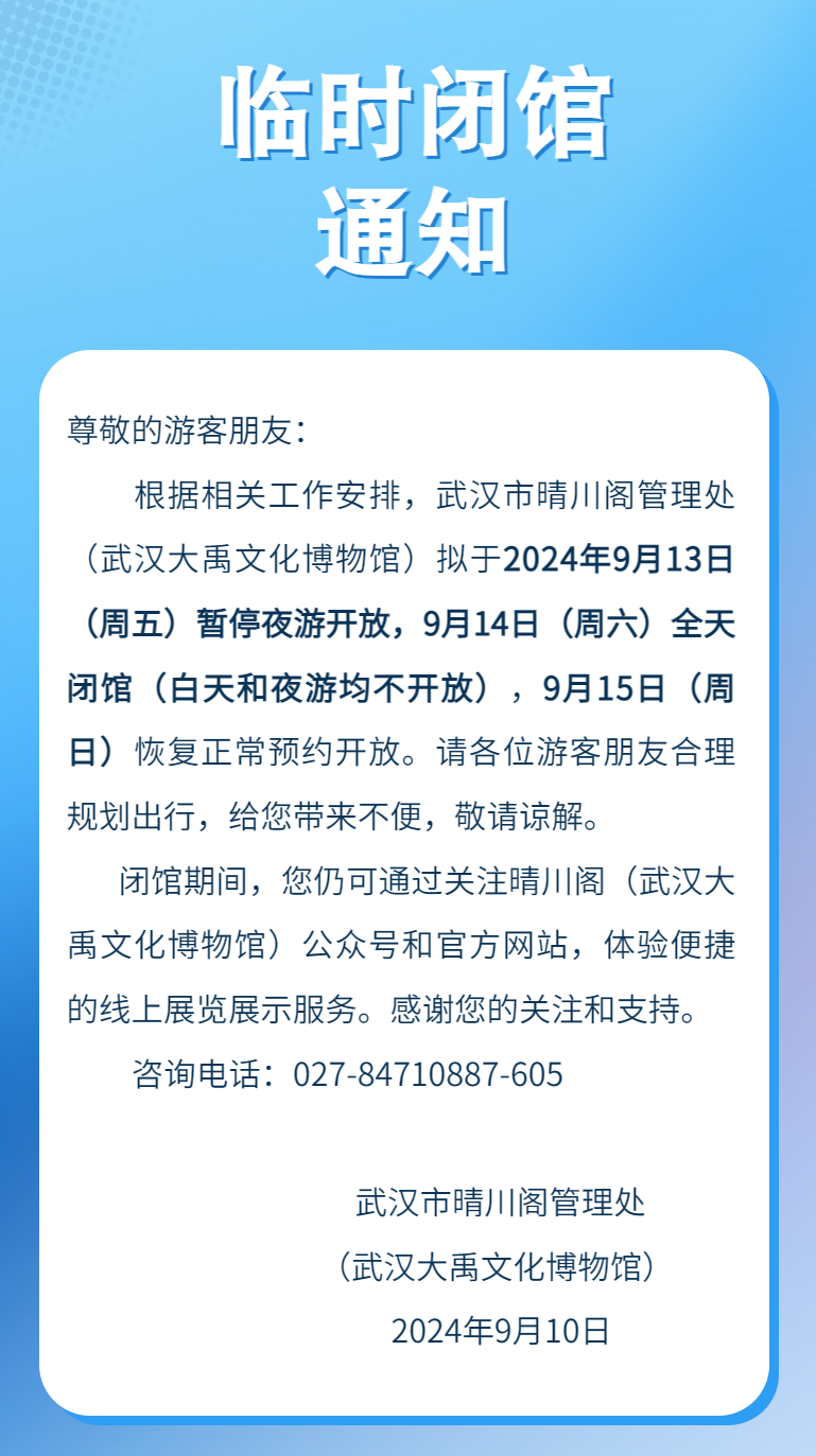 黄鹤楼、晴川阁等景点将临时关闭!武穴人莫跑空 2024-09-12 09:34 0 武汉长江文化艺术季开幕式将于2024年9月14日晚在武汉举办黄鹤楼公园晴川阁武汉大禹文化博物馆龟山公园知音号等发布临时关闭、停演、闭馆公告 详情如下↓↓↓黄鹤楼公园9月13日、14日暂停线上购票 《夜上黄鹤楼》临时停演游客告知函 晴川阁武汉大禹文化博物馆临时闭馆通知 龟山公园关于出入口临时关闭的温馨提示 “知音号”临时关闭公告 来源丨湖北发布