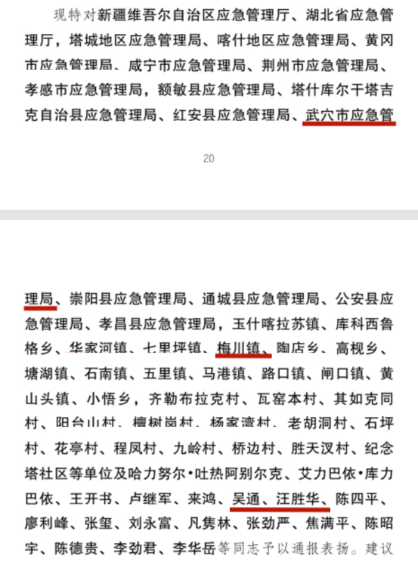 近日,应急管理部、湖北省减灾委相继下发通报表扬湖北多地成功避险避灾典型案例,黄冈市应急管理局、黄州区应急管理局、红安县应急管理局、武穴市应急管理局,华家河镇、七里坪镇、梅川镇、陶店乡人民政府,阳台山村、檀树岗村、杨家湾村以及干部王开书、卢继军、来鸿、吴通、汪胜华、陈四平等同志被点名表扬。