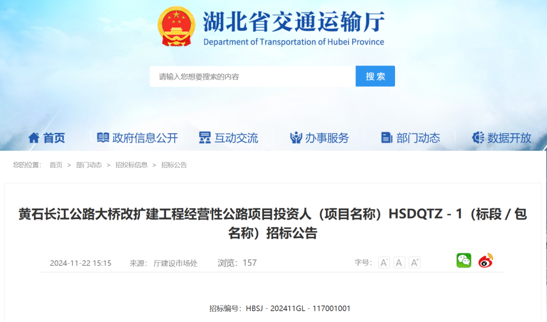 黄石长江公路大桥改扩建工程经营性公路项目投资人(项目名称)HSDQTZ-1(标段/包名称)招标公告