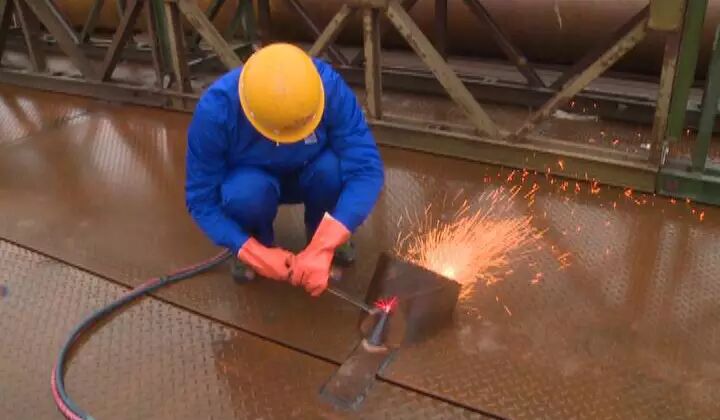 今天气温比较低,栈桥上也有些湿滑,人走路有些不稳,刚才点火的时候被吹灭了几次,但为了工期不耽误,这些我们都能克服。