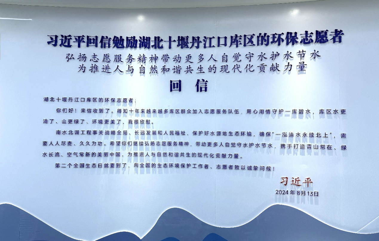 2024年8月13日,习近平总书记给十堰丹江口库区环保志愿者回信,总书记在回信中说“得知十年来越来越多库区群众加入志愿服务队伍,用心用情守护一库碧水,库区水更清了、山更绿了、环境更美了,我很欣慰。”