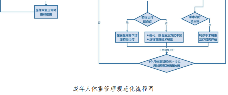 《体重管理指导原则(2024年版)》指出,所有有减重需求的个体都应接受全面的生活方式干预,无论是否联合药物或手术治疗,生活方式干预都是减重的基础。如果通过充分的综合生活方式干预仍无法减重,可以在严格评估后,考虑医学治疗进行干预,如药物或手术治疗。减重计划的实施,应强调长期坚持、循序渐进。对于大多数超重或轻度肥胖者(24.0kg/㎡≤BMI<32.5kg/㎡),建议初始时设立每周减轻体重约0.5~1kg 的目标,每月减轻2~4kg,6 个月内减轻当前体重的5%~15%并维持;对于中、重度肥胖者(BMI≥32.5kg/㎡),建议设立周、月目标,定期评估,按减轻现体重的 5%、10%、15%划分阶段性减重目标,周期为3至6个月。吃动平衡是管理与维持健康体重的关键。要保持健康的生活方式,合理膳食,适量运动,戒烟限酒,保持积极的心态和良好的睡眠习惯。(一)自我监测。自我监测是体重管理与维持的重要步骤之一。定期定时称重,跟踪体重变化。记录每日的饮食和身体活动,及时发现问题并调整。(二)合理膳食。合理膳食是维持健康体重的基础,应根据个体的年龄、性别和身体活动水平等因素进行调整,确保摄入足够的能量和营养素。三餐的食物能量分配及间隔时间要合理,一般早、晚餐各占30%,午餐占40%。充足饮水,减少高糖、高油、高盐食物。选择蒸、煮、炖、拌,减少煎、烤、炸等烹饪方式。(三)适量运动。遵循 “动则有益、多动更好、适度量力、贵在坚持”的总原则,并达到相关人群的身体活动推荐量。每周至少150分钟中等强度有氧运动及2~3次抗阻训练。将身体活动融入日常生活中,达到维持健康体重的目的。《体重管理指导原则(2024年版)》中