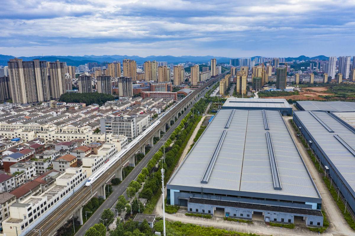 图为航拍咸宁高新区,一列城铁列车穿城而过。 (湖北日报全媒记者 魏铼 摄)