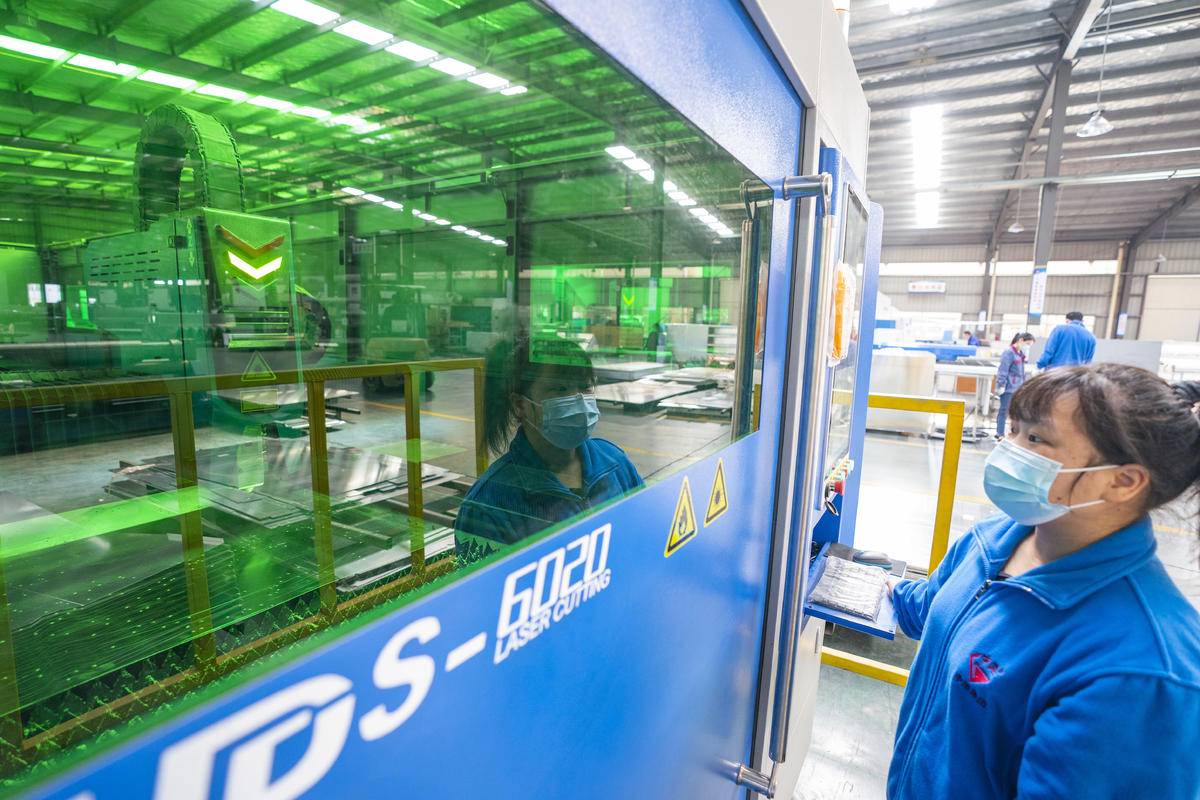图为位于咸安经济开发区的湖北中港金属制造有限公司车间,工人们在操作激光切割机赶制幕墙铝板订单。(湖北日报全媒记者 魏铼 摄)