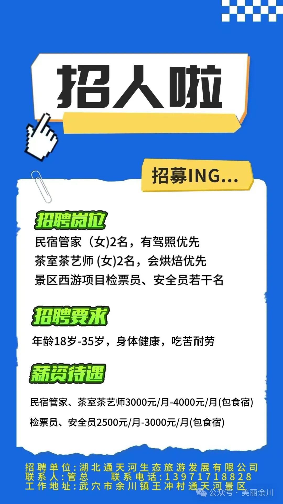 想找一份既能施展才华,又能在如画美景中工作的好差事吗?现在机会来啦!湖北通天河生态旅游发展有限公司开启火热招聘,就等你来加入!民宿管家(女)2名:如果你持有驾照,那更是加分项!年龄在18岁 - 35岁之间,身体健康,能吃苦耐劳,就赶紧来报名。在风景如画的民宿里,你将化身游客的贴心管家,为他们的旅途增添温暖与舒适。茶室茶艺师(女)2名:会茶艺的你千万别错过!同样要求年龄18 - 35岁,身体素质良好,能踏实工作。在这里,你可以在茶香四溢中,展示精湛的茶艺,为游客带来极致的品茶体验。景区西游项目检票员、安全员若干名:只要你符合18 - 35岁,身体健康、吃苦耐劳的条件,都能来应聘。在充满奇幻色彩的西游主题项目里,你的工作将为游客的欢乐之旅保驾护航。民宿管家和茶室茶艺师月薪3000元 - 4000元,景区检票员、安全员月薪2500元 - 3000元,并且全部包食宿!让你在安心工作的同时,没有生活的后顾之忧。别犹豫,赶紧打电话咨询报名,开启你的精彩职场之旅,一起为余川镇的旅游发展添砖加瓦!