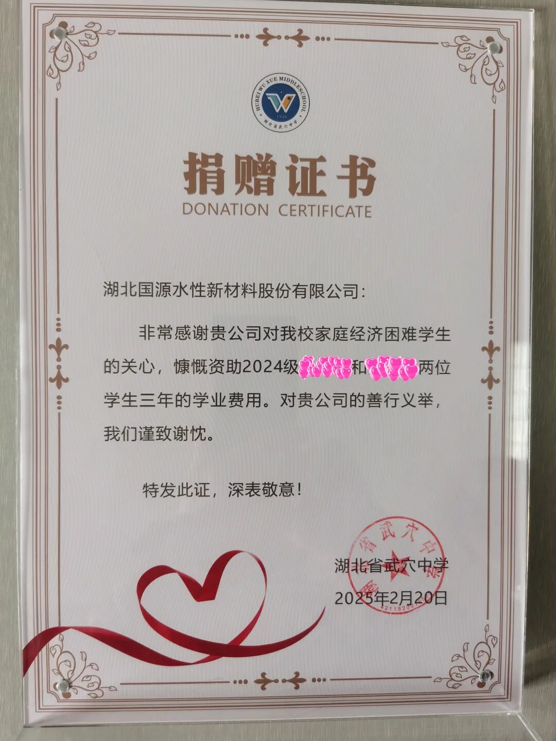 2025年3月6日,春风和煦,阳光明媚。上午10时,武穴中学党委书记胡启云一行专程驱车来到龙坪镇湖北国源水性新材料股份有限公司,向公司董事长周广渊致以诚挚的感谢,并送上加盖公章的“捐赠证书”。这一暖心之举,标志着周广渊对两位寒门学子的郑重承诺圆满兑现,也为2025年武穴教育助学领域增添了一段佳话。