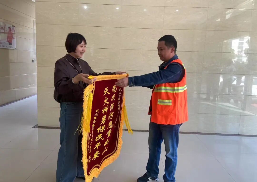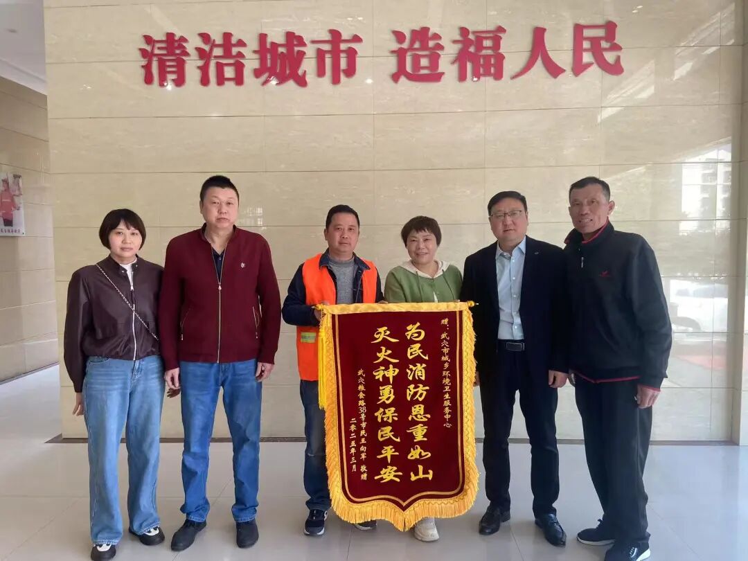 “非常感谢环卫司机武钧宁同志,见义勇为,勇敢救火,避免了可能造成的严重后果……”3月24日上午,市民王先生将一面绣有“为民消防恩重如山 灭火神勇保民平安”的锦旗送到了市环卫中心,握着环卫工人的手激动地说。
