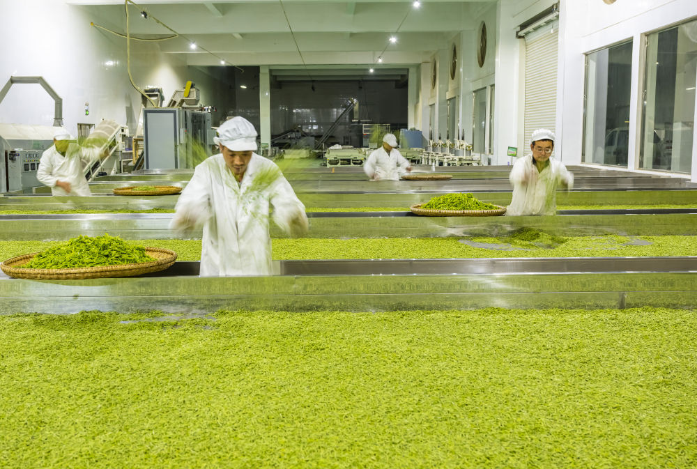 工人在秭归县九畹丝绵茶加工车间对刚收购的鲜叶进行加工。新华社发(郑家裕摄)