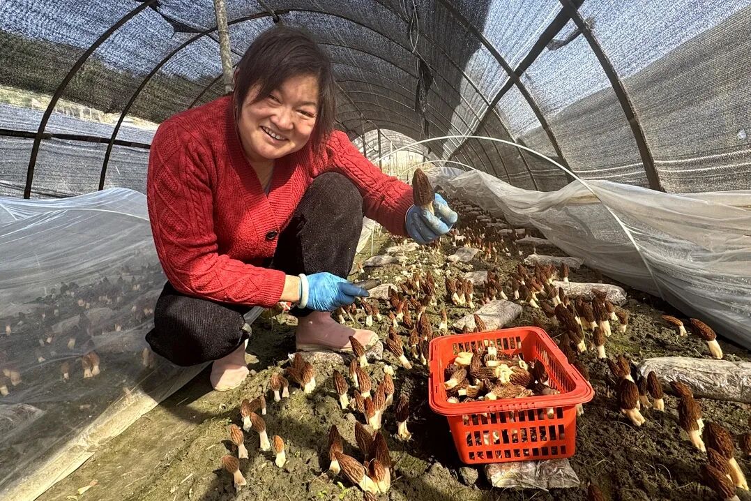 种植户田桂红手持工具,小心翼翼地将达到采收标准的羊肚菌采摘入篮。