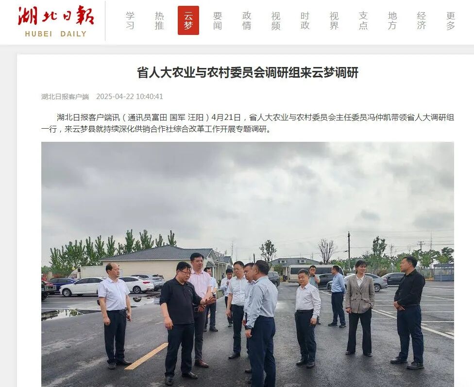 据“湖北日报”客户端报道,4月21日,省人大农业与农村委员会主任委员冯仲凯带领省人大调研组一行,来云梦县就持续深化供销合作社综合改革工作开展专题调研。在省供销社党组成员、副主任刘堂军,孝感市人大常委会党组成员、副主任董明炜,孝感市人大常委会委员、农村委主任委员刘华林,孝感市供销社党组书记、主任李志平以及云梦县人大常委会副主任万献忠,云梦县供销社党组书记、主任胡国法等陪同下,冯仲凯等领导一行先后深入云梦县胡金店镇、清明河乡、倒店乡、云梦城乡供应链园区、城隍庙商业街等地,全面了解云梦县供销社社有企业、基层供销合作社的功能性质、治理结构、村级组织经营体系建设、一网四链平台搭建、县级共配中心运行、寄递物流、农产品上行、日用品下行、农村综合服务机制、社有资产管理、资源人才等要素保障、地方党委政府领导支持以及政策落实等方面的情况;听取了基层对《湖北省供销合作社条例》立法的必要性、可行性以及地方对加快做实供销综合改革的意见和建议。