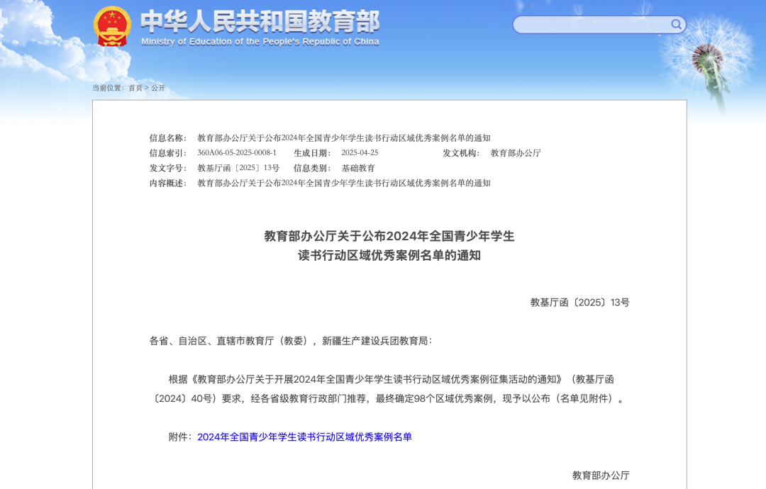 教育部公布最新名单,武穴入选 2025-05-08 08:44 0 近日 教育部公布2024年全国青少年学生 读书行动区域优秀案例名单 经各省级教育行政部门推荐 最终确定98个区域优秀案例 其中湖北省三个武穴为黄冈唯一入选县市 2024年全国青少年学生 读书行动区域优秀案例名单 来源丨微信教育