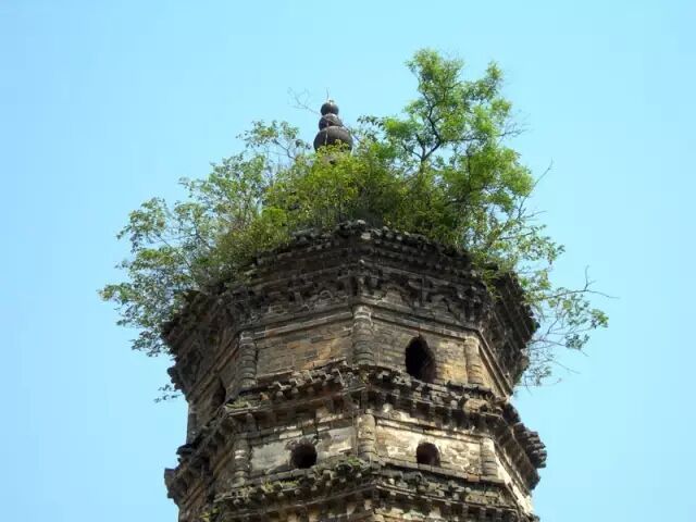 古塔共有七层八面,每层外墙的四周靠近上一层的位置,都有雕刻的花形图案,连同那些密檐翘角的构件,古朴典雅,美丽大方。最上一层翘角的地方,还保留有人工雕凿的石孔,有铜链与三级葫芦型塔尖相连。我不明白这些小孔的作用,就向群姐请教。