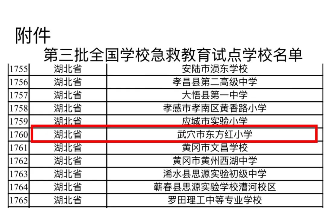 此次入选第三批全国学校急救教育试点学校,是对武穴市东方红小学急救教育工作的充分肯定,更是赋予了学校新的使命与责任。未来,学校将以此为契机,充分发挥试点学校的示范引领作用,进一步优化急救教育课程,创新教学方法,丰富实践活动形式,提高师生的急救意识和自救互救能力,让急救知识在校园广泛传播,为师生的生命健康保驾护航!同时,积极向兄弟学校分享经验,辐射带动区域内学校共同提升急救教育水平,为构建平安校园、健康社会贡献更多力量!